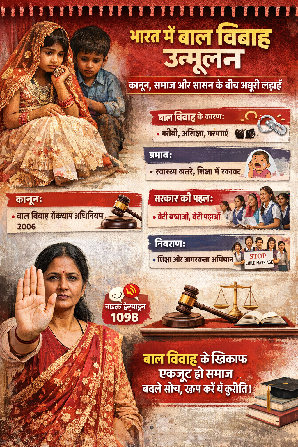 भारत जैसे तेजी से विकसित हो रहे देश में बाल विवाह का अस्तित्व एक गहरी सामाजिक विडंबना को दर्शाता है। तकनीकी प्रगति, शिक्षा के विस्तार और महिला सशक्तिकरण के दावों के बावजूद कई क्षेत्रों में कम उम्र में विवाह की परंपरा आज भी जारी है। यह केवल एक पारिवारिक निर्णय नहीं, बल्कि सामाजिक संरचना और मानसिकता का प्रतिबिंब है। बाल विवाह बच्चों के अधिकारों का उल्लंघन है और राष्ट्र की मानव संसाधन क्षमता को कमजोर करता है।