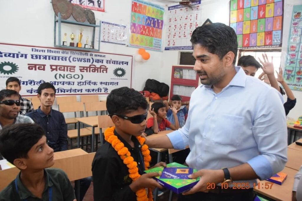 प्रकाश और उमंग के पावन पर्व दीपावली के अवसर पर सिंगरौली के कलेक्टर गौरव बैनल ने दिव्यांग बच्चों के साथ मिलकर त्योहार की खुशियाँ साझा कीं। जिला मुख्यालय स्थित सीडब्ल्यूएसएन छात्रावास, बैढ़न (नव प्रवाह समिति द्वारा संचालित) में पहुंचे कलेक्टर बैनल ने बच्चों से आत्मीयता से संवाद किया, उन्हें मिठाइयाँ खिलाकर मुंह मीठा कराया और फूल-मालाओं से स्वागत कर उनका उत्साहवर्धन किया।