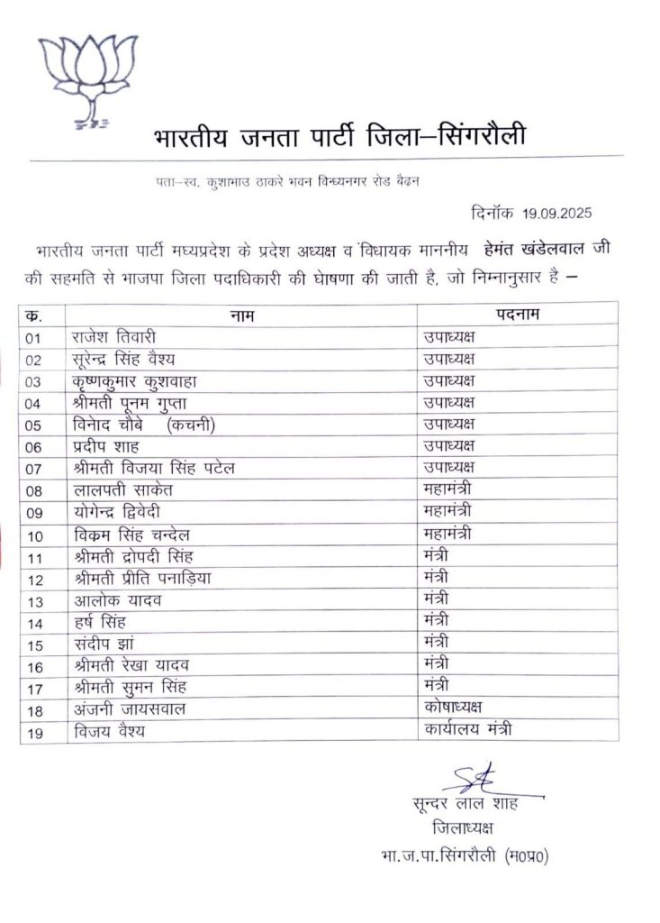 भाजपा जिला सिंगरौली की नई कार्यकारिणी घोषित