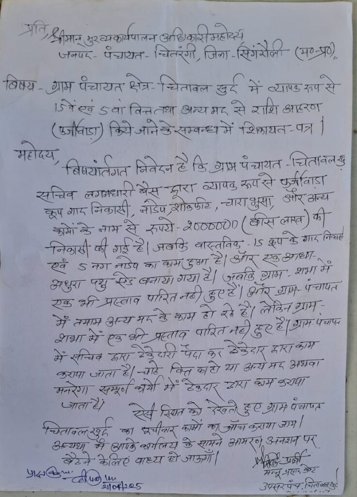 सिंगरौली// चितरंगी ब्लॉक अंतर्गत ग्राम पंचायत चितावल खुर्द में भ्रष्टाचार करने का गंभीर मामला सामने आया…